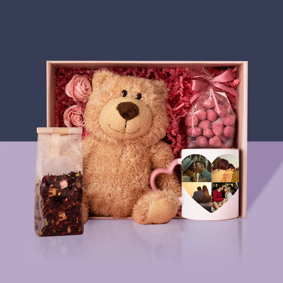 €31,99Grundpreis /Nicht verfügbarForm-Collage: Jahrestag Herz - Geschenkset mit Tasse, Teddybär und Süßigkeiten