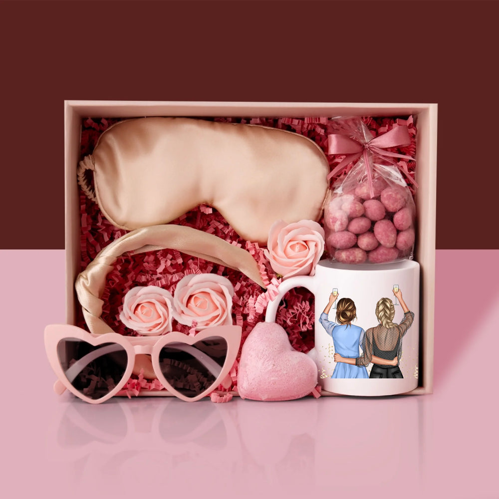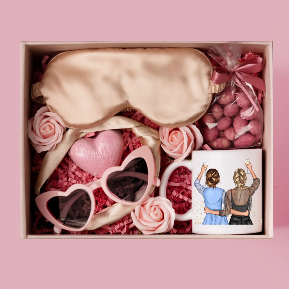 Das Set enthält Schokoladenmandeln, eine herzförmige Badebombe, eine Augenmaske, herzförmige Gläser und Seifenrosen.
