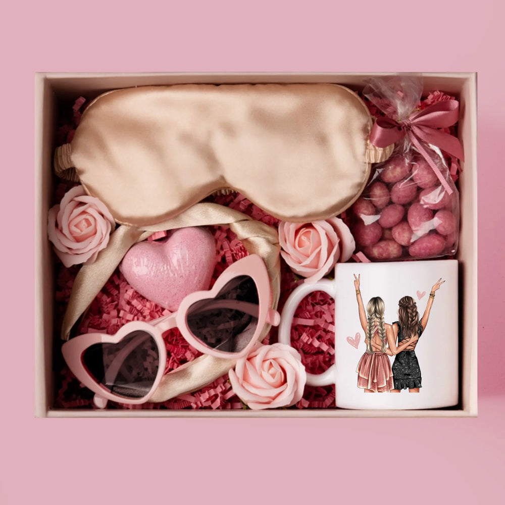 Das Set enthält Schokoladenmandeln, eine herzförmige Badebombe, eine Augenmaske, herzförmige Gläser und Seifenrosen.