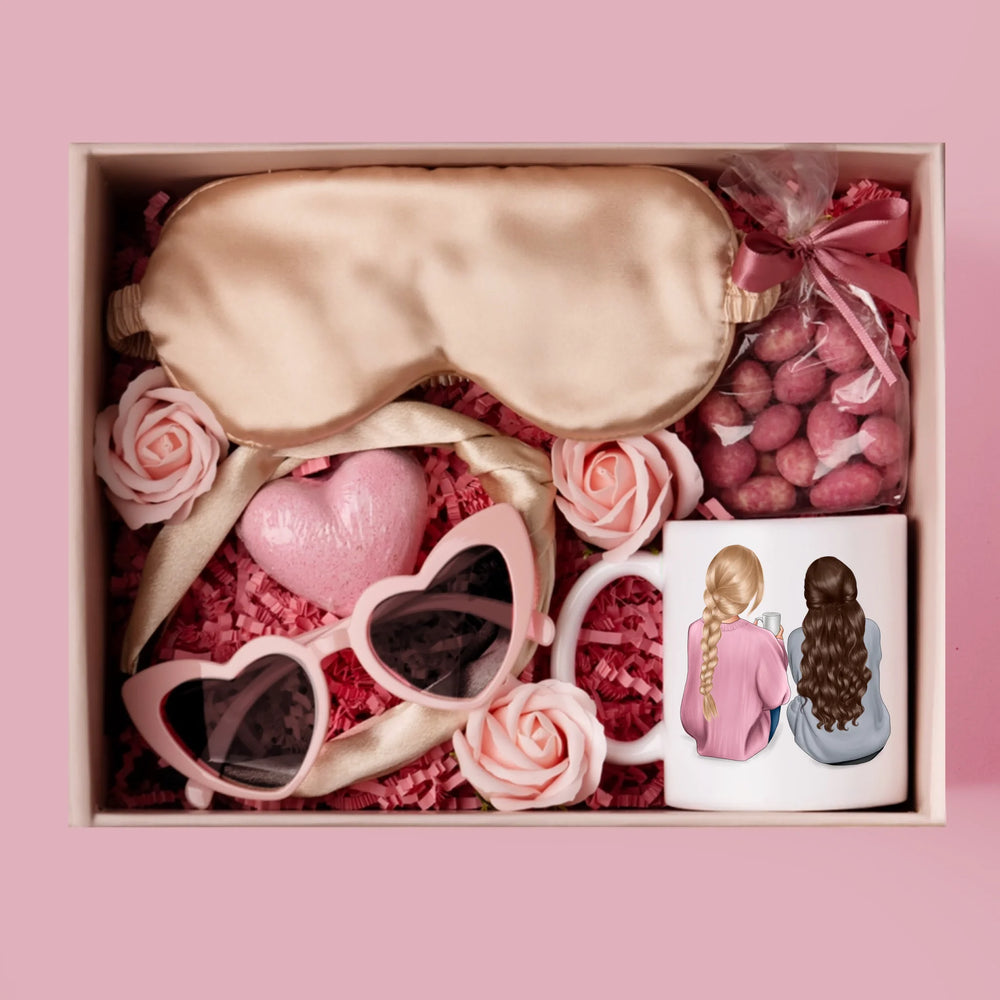 Das Set enthält Schokoladenmandeln, eine herzförmige Badebombe, eine Augenmaske, herzförmige Gläser und Seifenrosen.