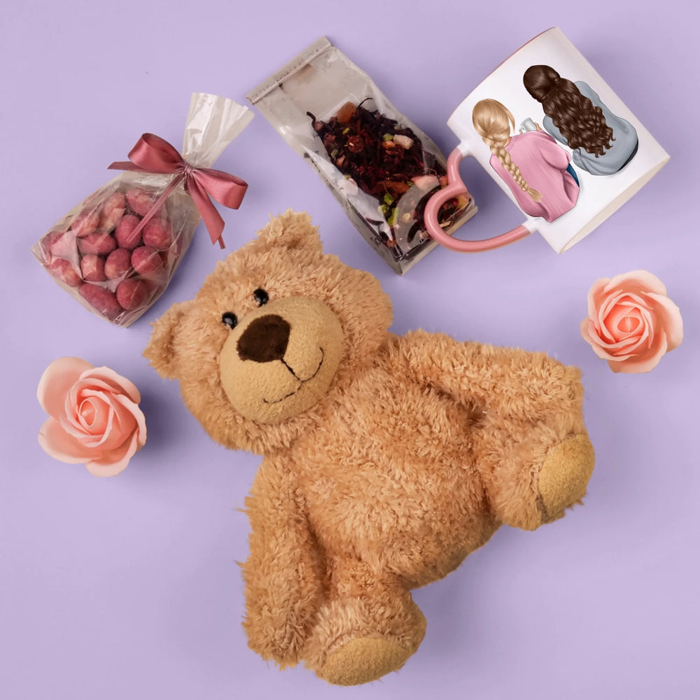 Ein wunderschönes Geschenkset mit einer Tasse mit Wunsch-Personalisierung, einem süßen Teddybären und Süßigkeiten.