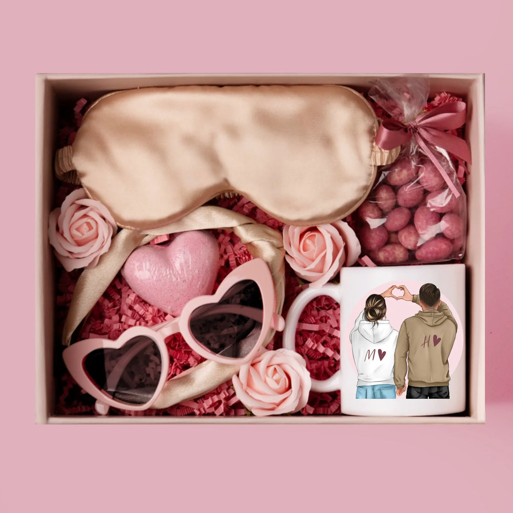 Das Set enthält Schokoladenmandeln, eine herzförmige Badebombe, eine Augenmaske, herzförmige Gläser und Seifenrosen.