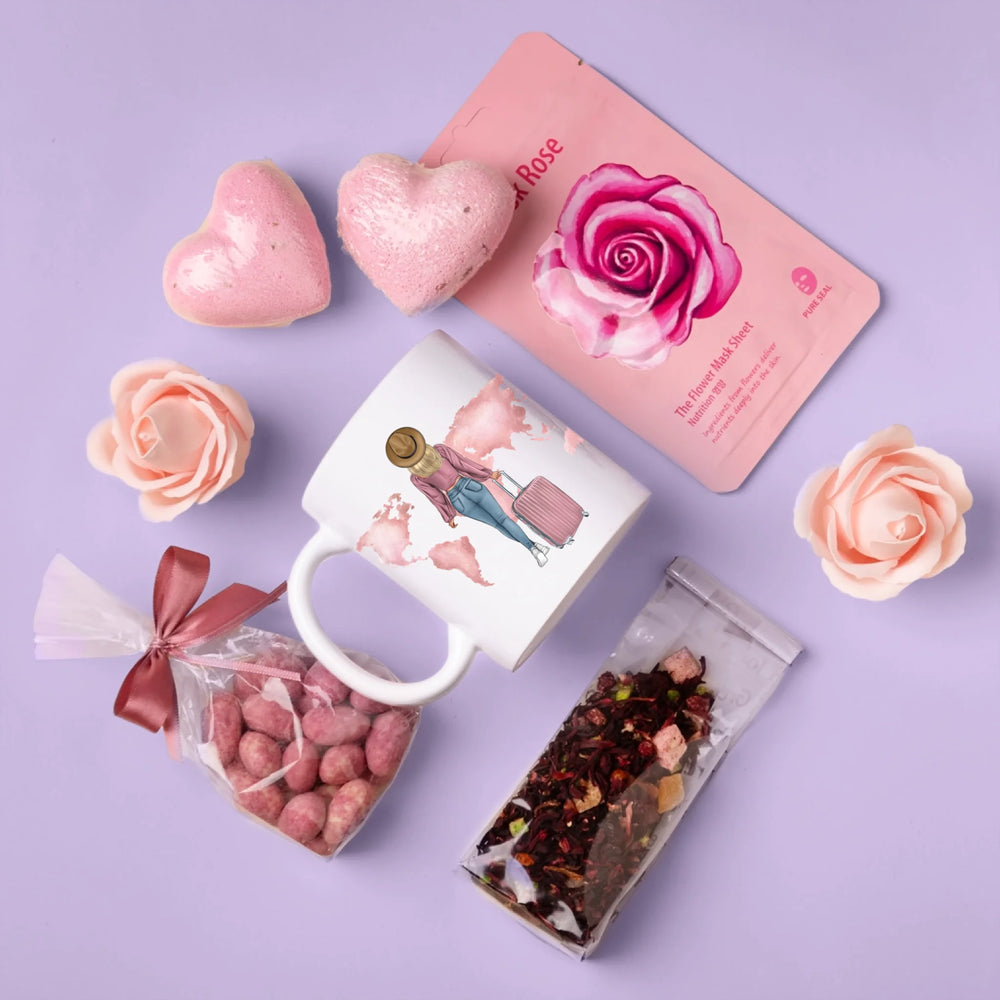 • Das Set enthält Schokoladenmandeln, Früchtetee, eine Tuchmaske, eine herzförmige Badebombe und Seifenrosen.