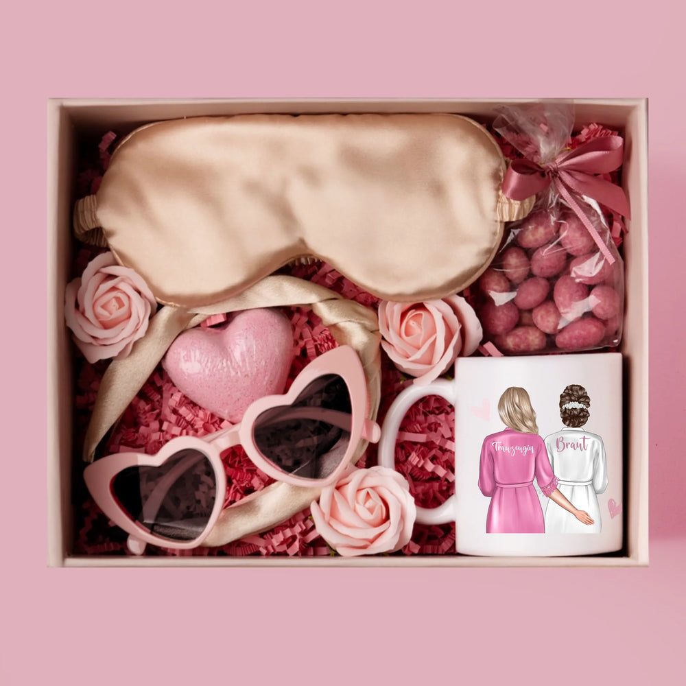 Das Set enthält Schokoladenmandeln, eine herzförmige Badebombe, eine Augenmaske, herzförmige Gläser und Seifenrosen.