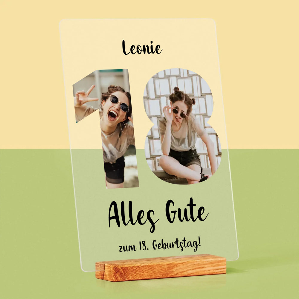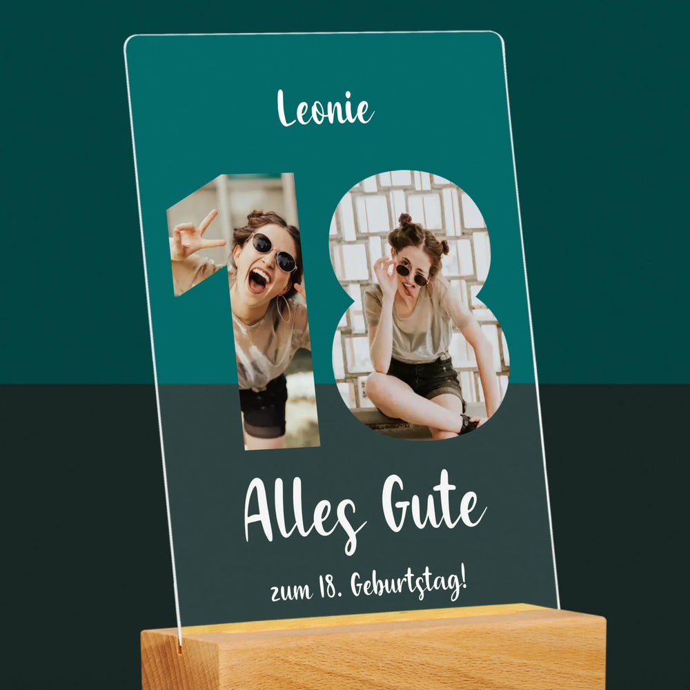 Buchstaben-Collage: 18. Geburtstag - Druck auf Acrylglas mit LED-Beleuchtung