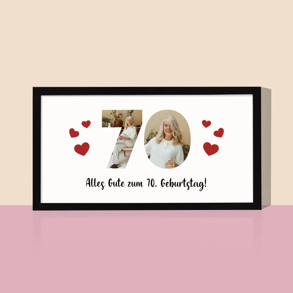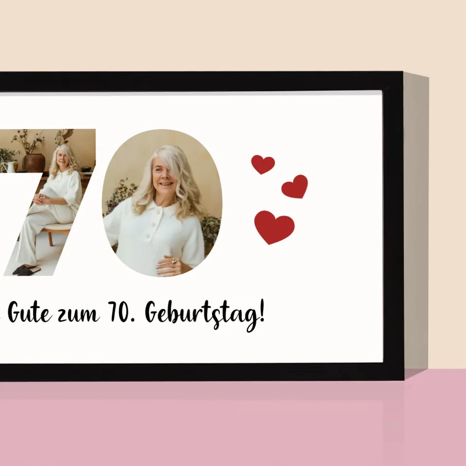 Buchstaben-Collage: 70. Geburtstag - Druck mit Rahmen 20x40 - Horizontal