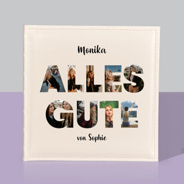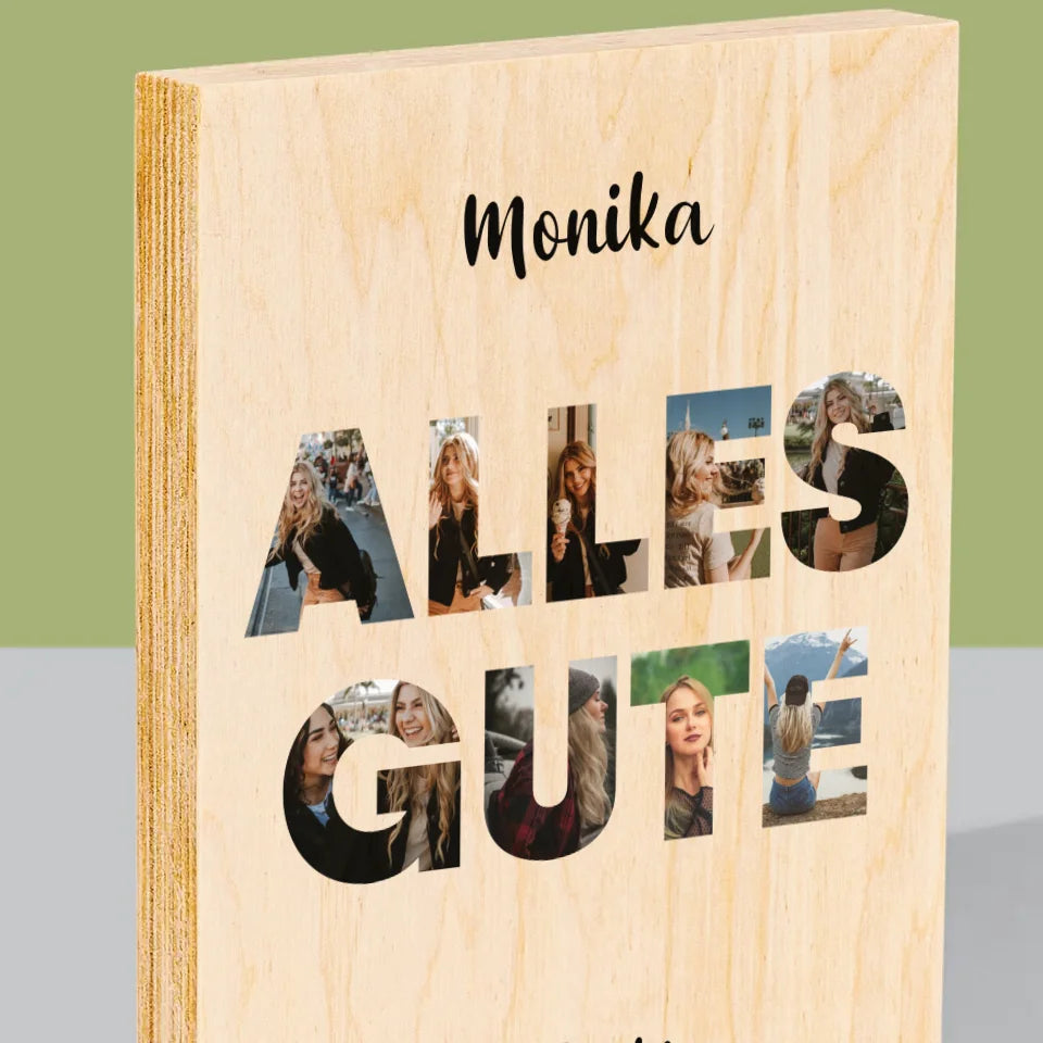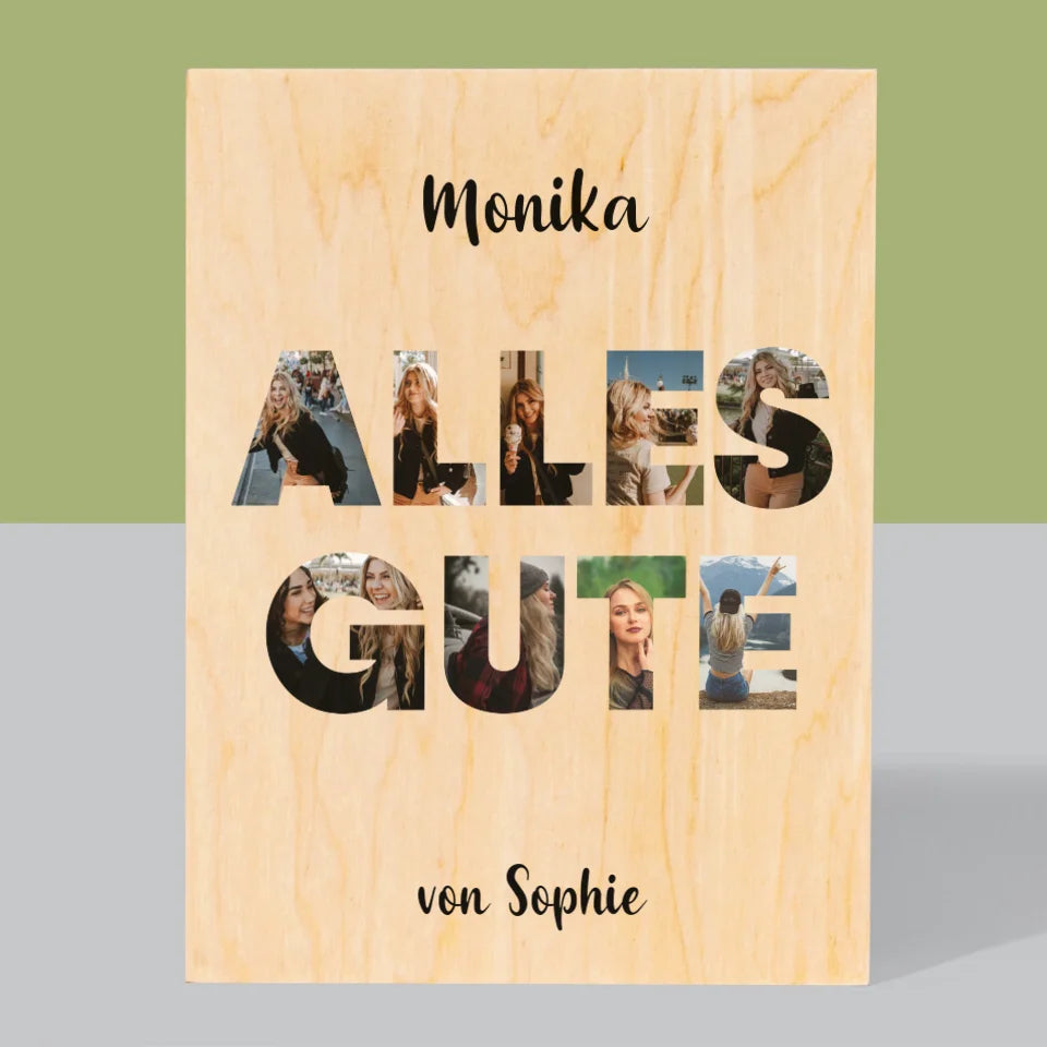 Buchstaben-Collage: Alles Gute - Druck auf Holz - Vertikal