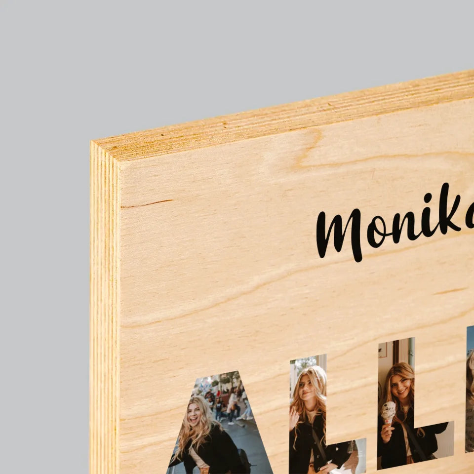 Druck auf einem 1,8 cm dicken Holzblock, individuell personalisiert.