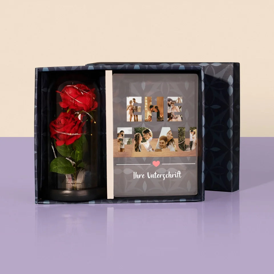 Buchstaben-Collage: Ehefrau - Geschenkset mit Druck auf Acrylglas und ewiger Rose