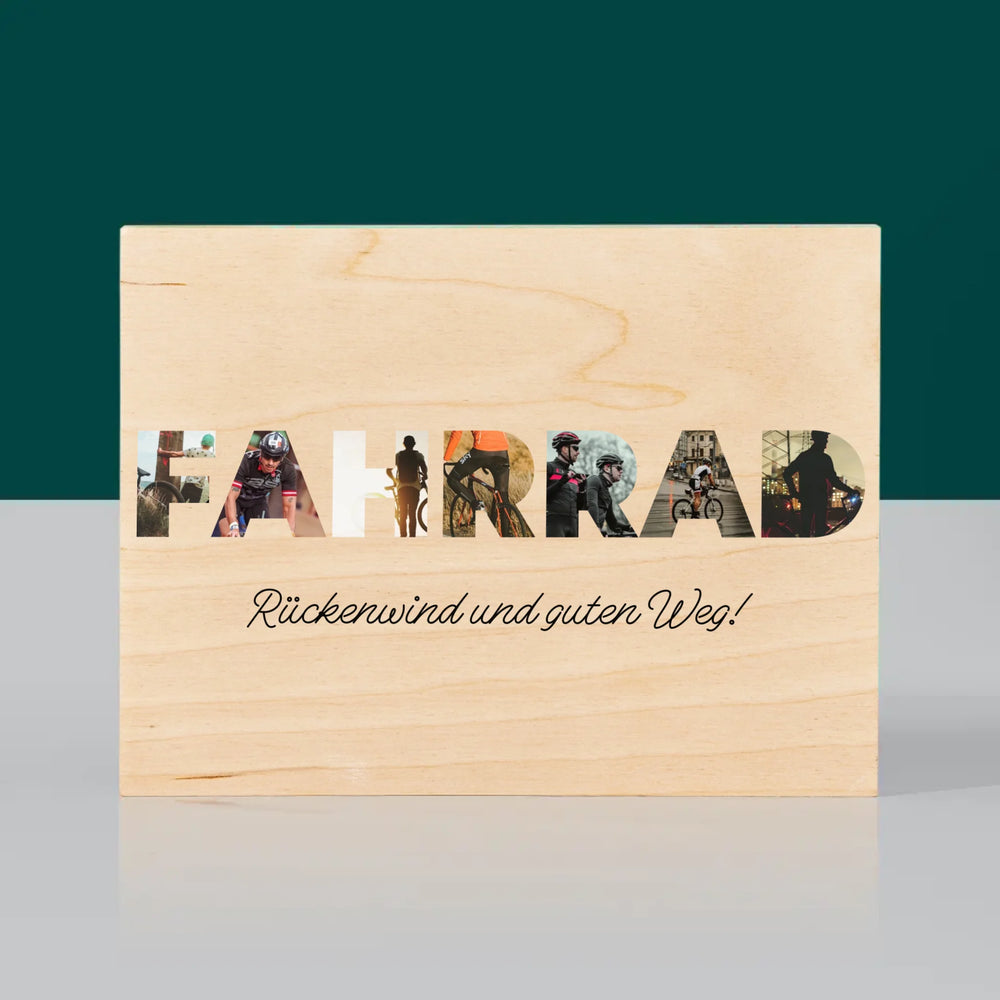 Buchstaben-Collage: Fahrrad - Druck auf Holz - Horizontal