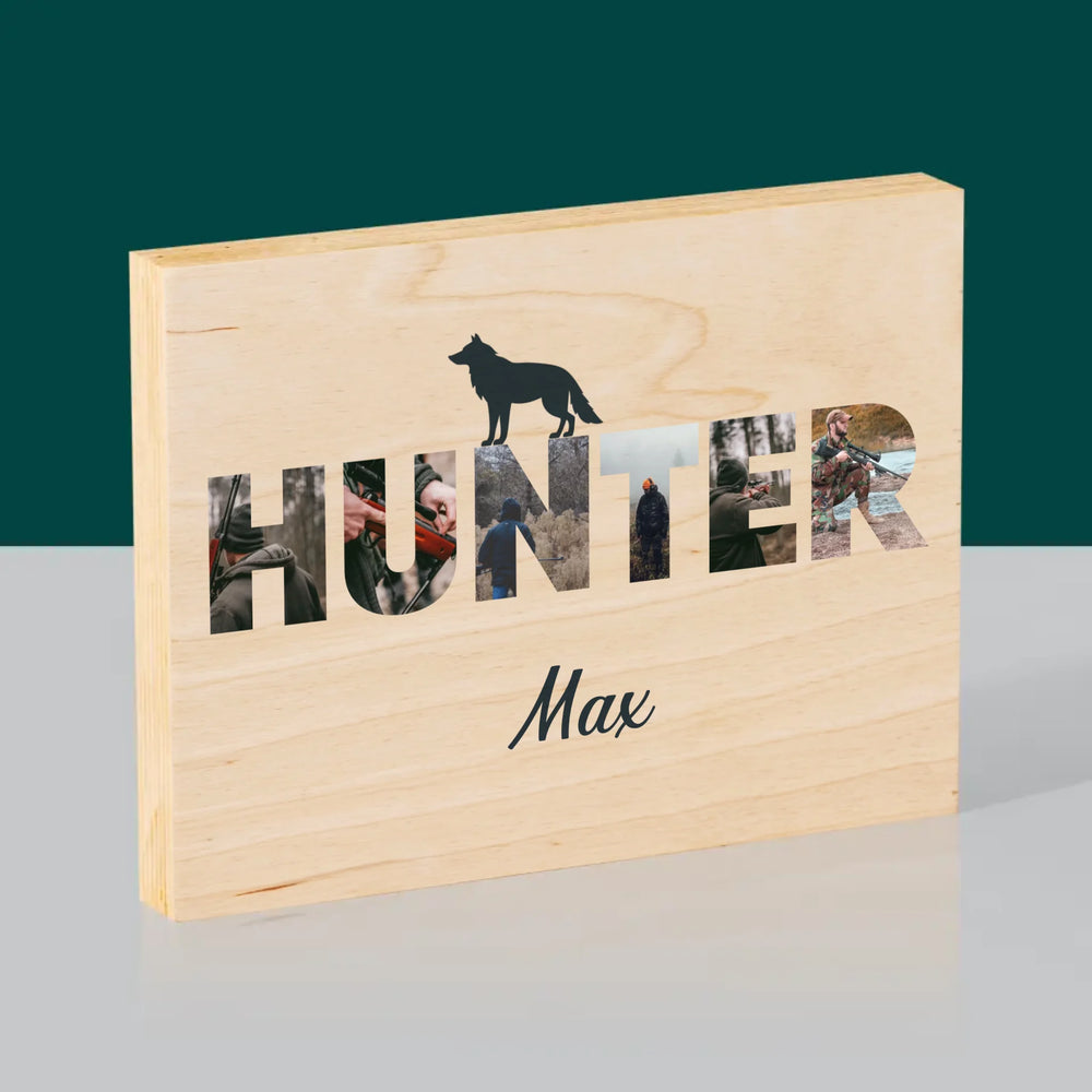 Buchstaben-Collage: Hunter - Druck auf Holz - Horizontal