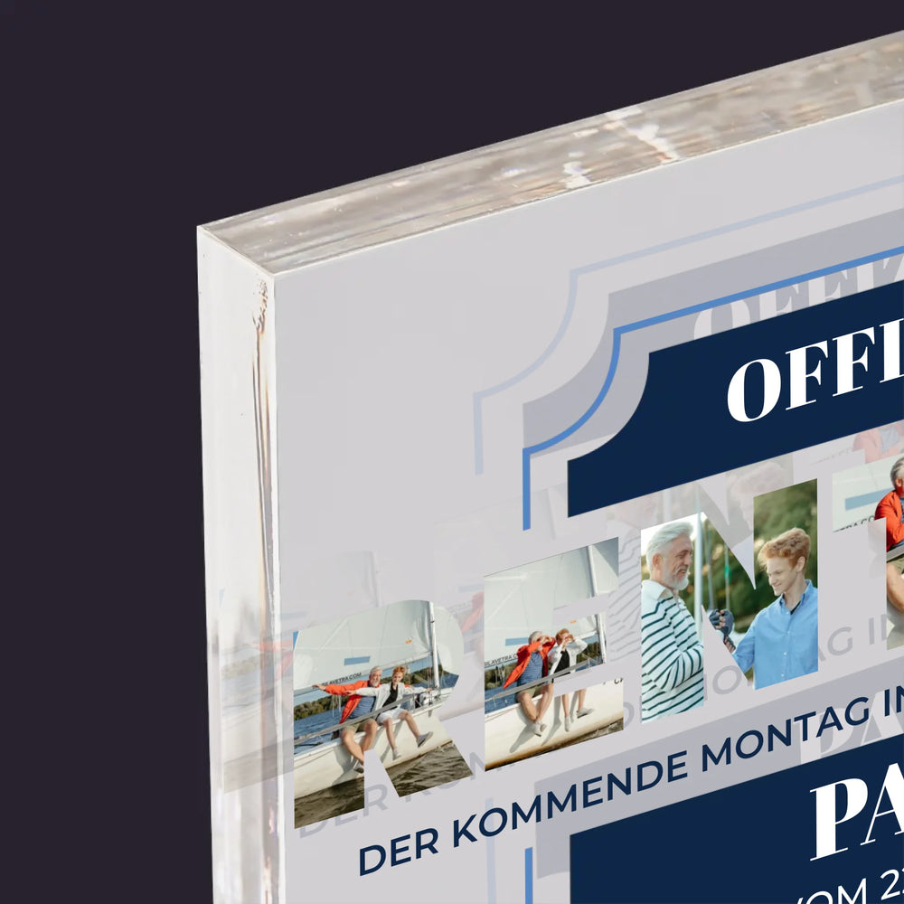 Buchstaben-Collage: Offiziell Im Ruhestand - Acrylblock - Horizontal