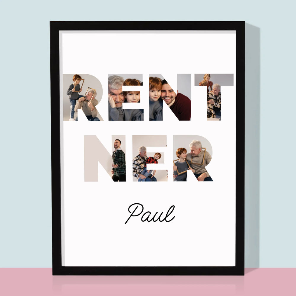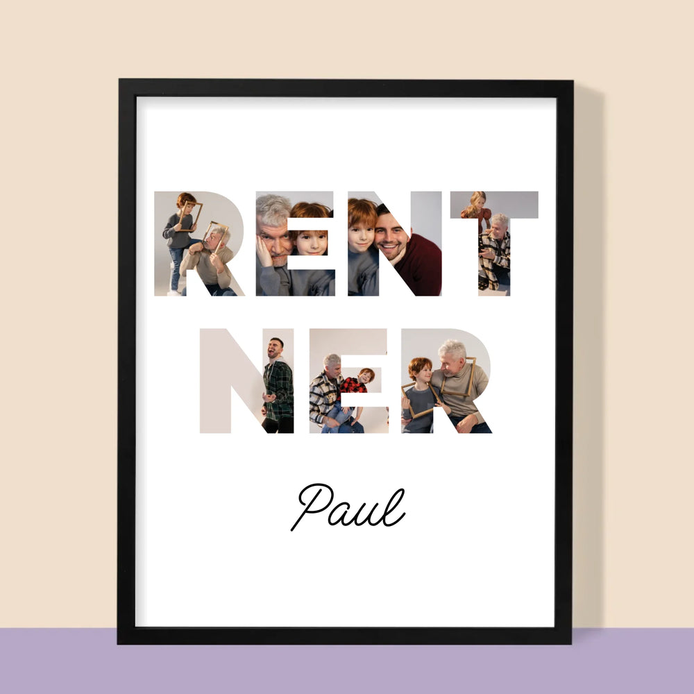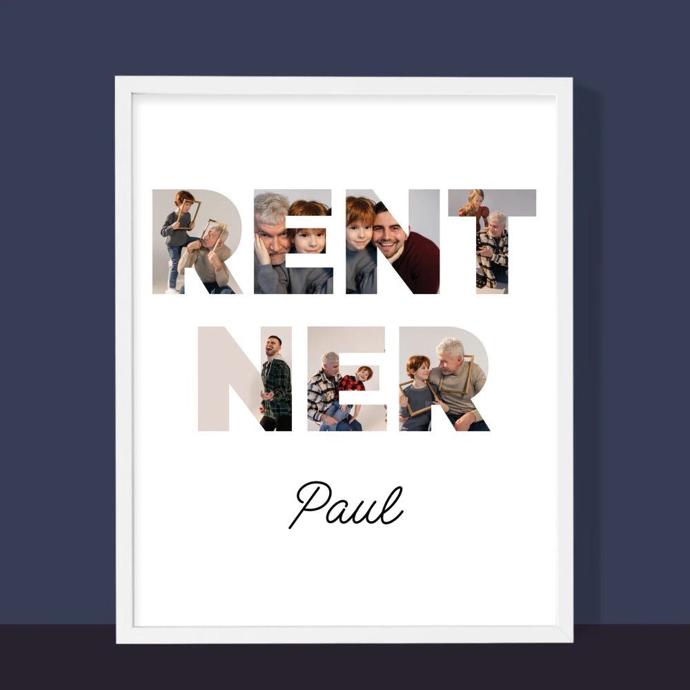 Buchstaben-Collage: Rentner - Druck mit Rahmen - Vertikal