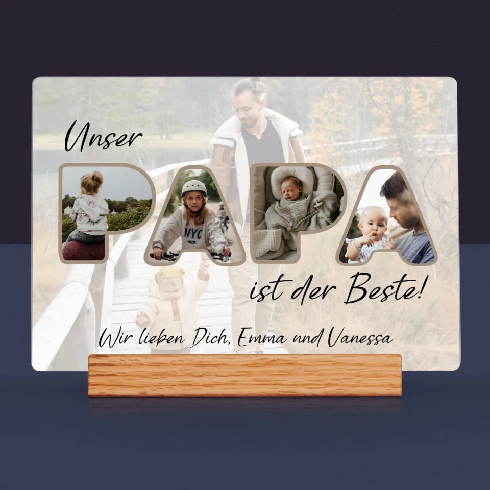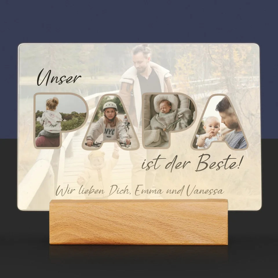 Buchstaben-Collage: Unser Papa Ist Der Beste - Druck auf Acrylglas mit LED-Beleuchtung
