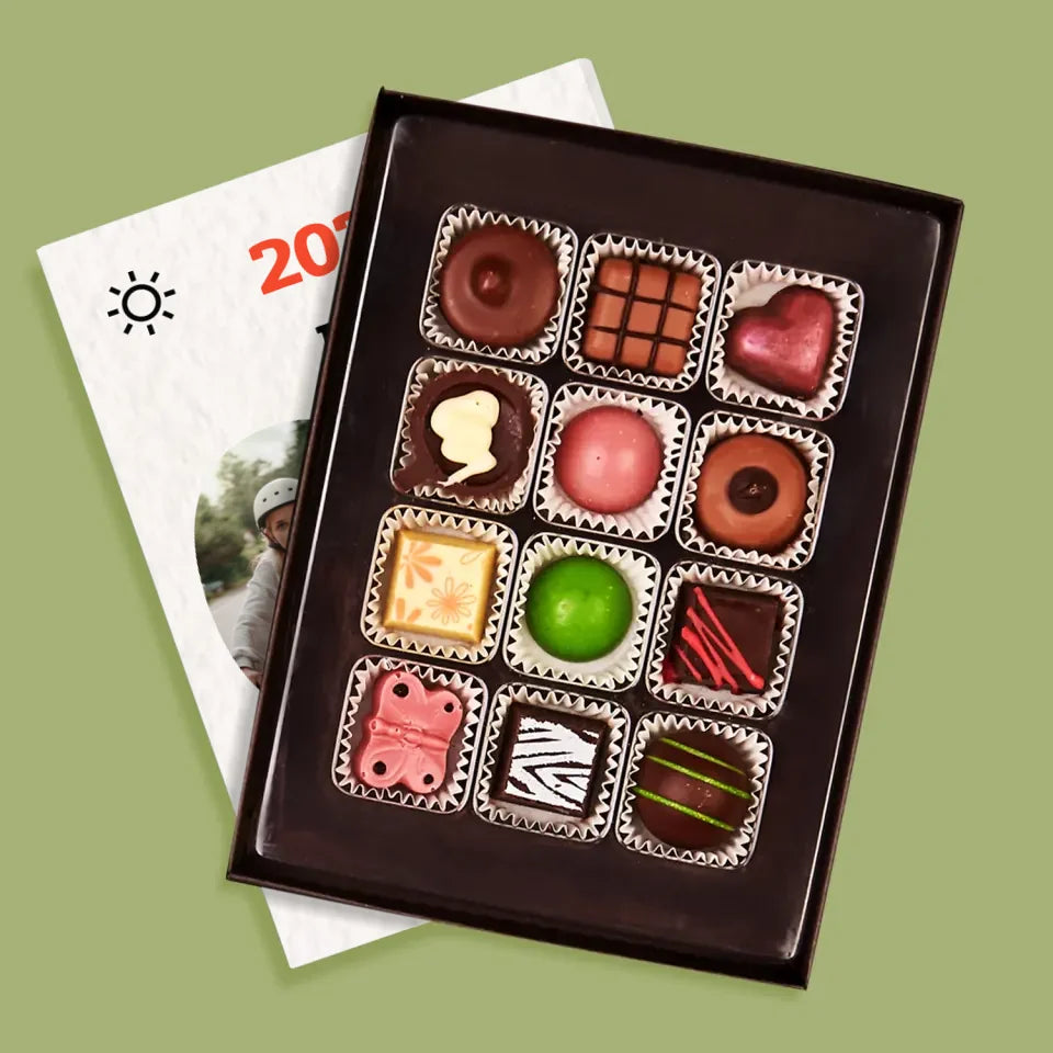 Leckere Pralinen aus belgischer Schokolade in einer eleganten Schachtel, individuell personalisiert.