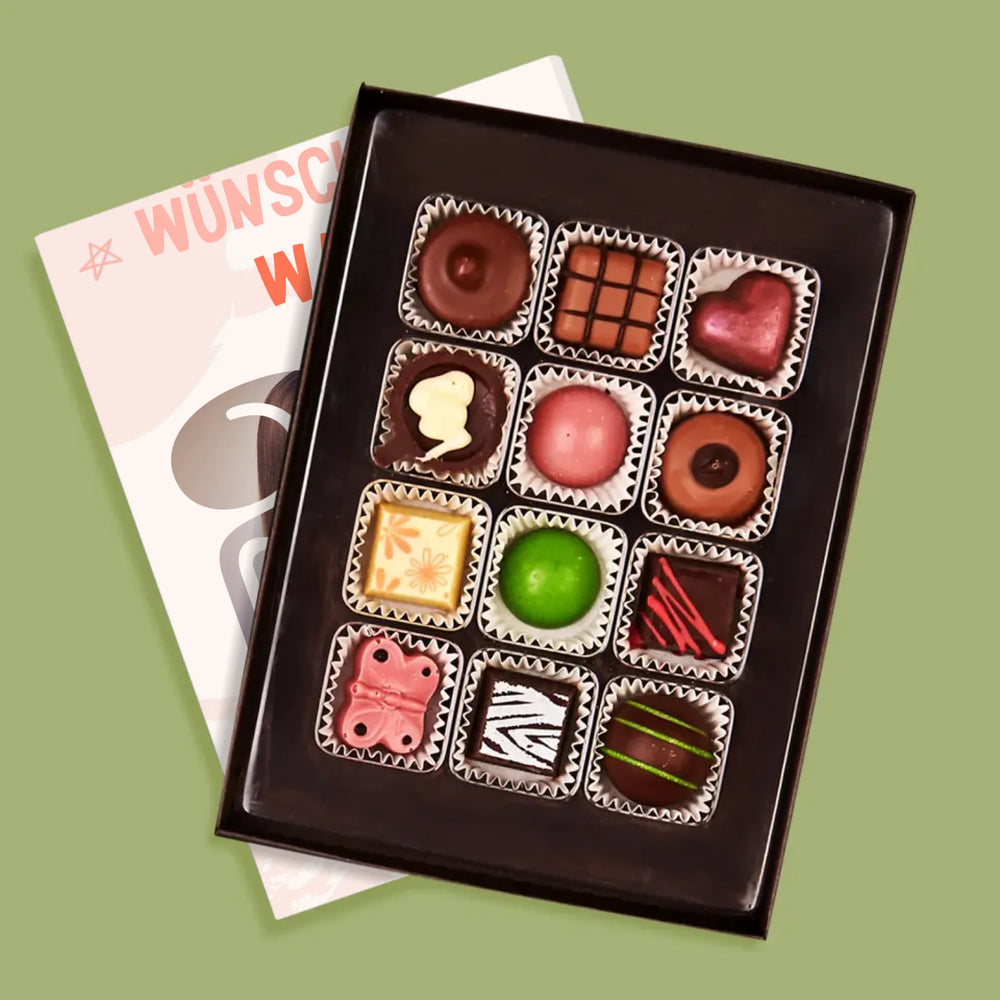 Leckere Pralinen aus belgischer Schokolade in einer eleganten Schachtel, individuell personalisiert.