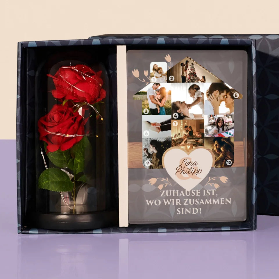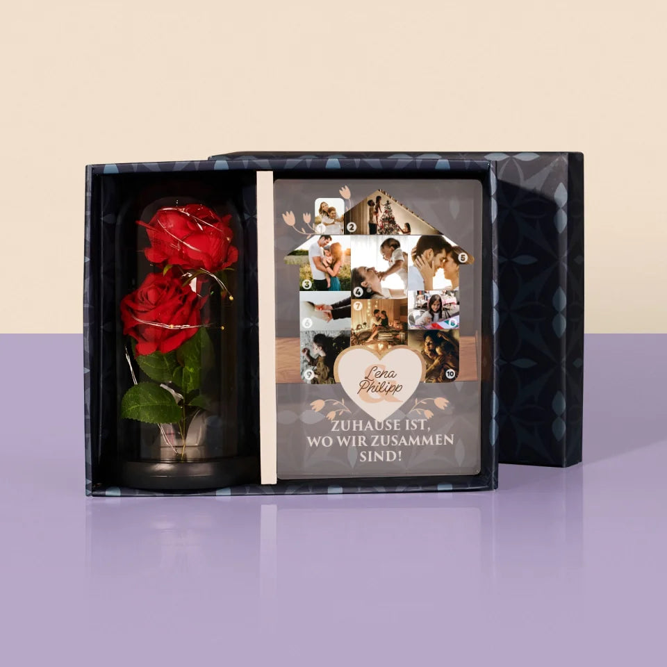 Form-Collage: Familienhaus - Geschenkset mit Druck auf Acrylglas und ewiger Rose