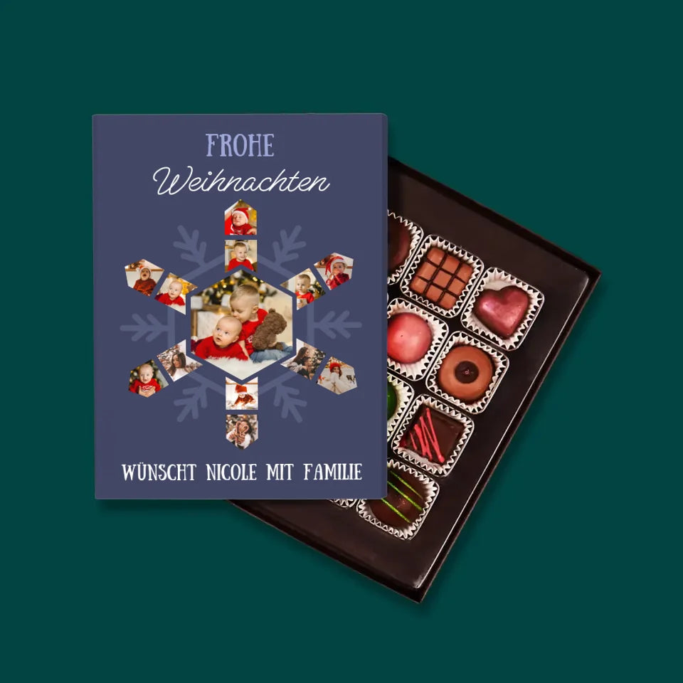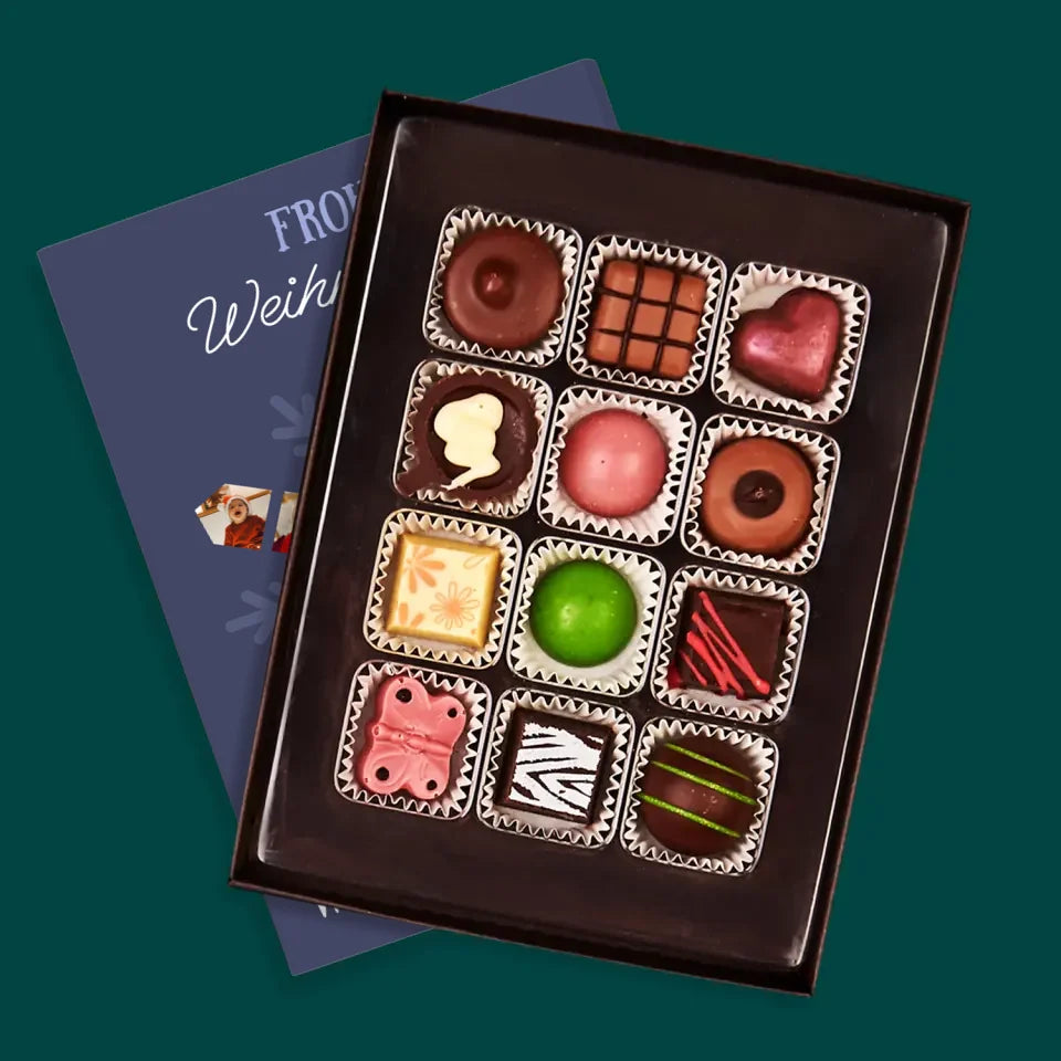 Leckere Pralinen aus belgischer Schokolade in einer eleganten Schachtel, individuell personalisiert.