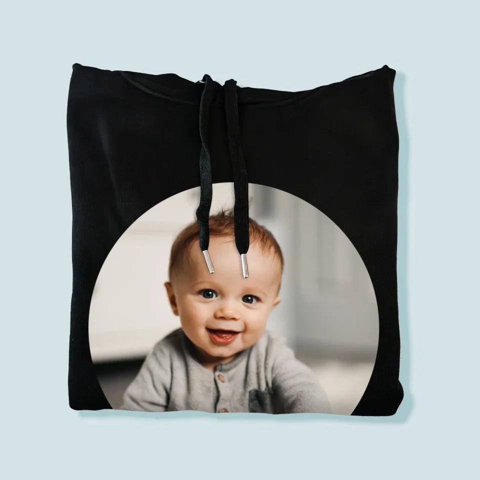 Das personalisierte Motiv wird auf der Vorderseite des Hoodies platziert und sieht toll aus!