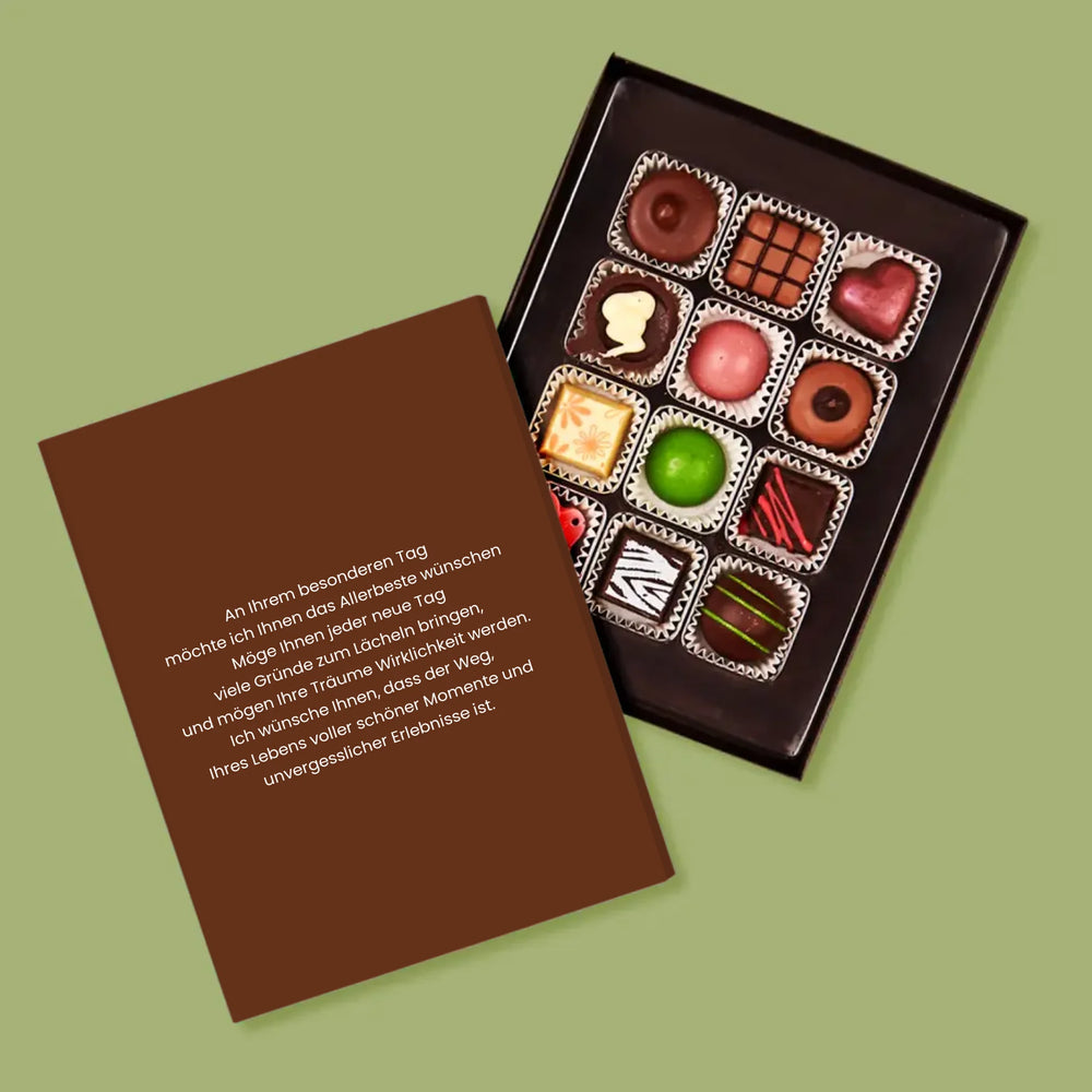 Leckere Pralinen aus belgischer Schokolade in einer eleganten Schachtel, individuell personalisiert.