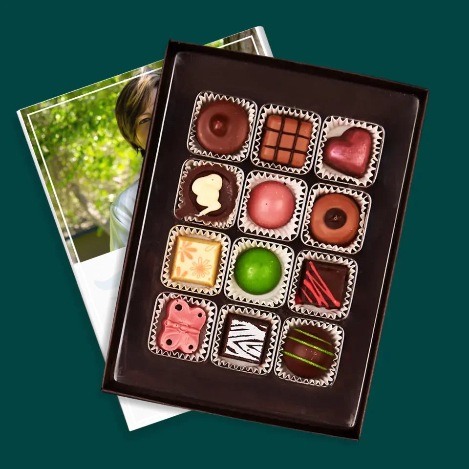 Leckere Pralinen aus belgischer Schokolade in einer eleganten Schachtel, individuell personalisiert.