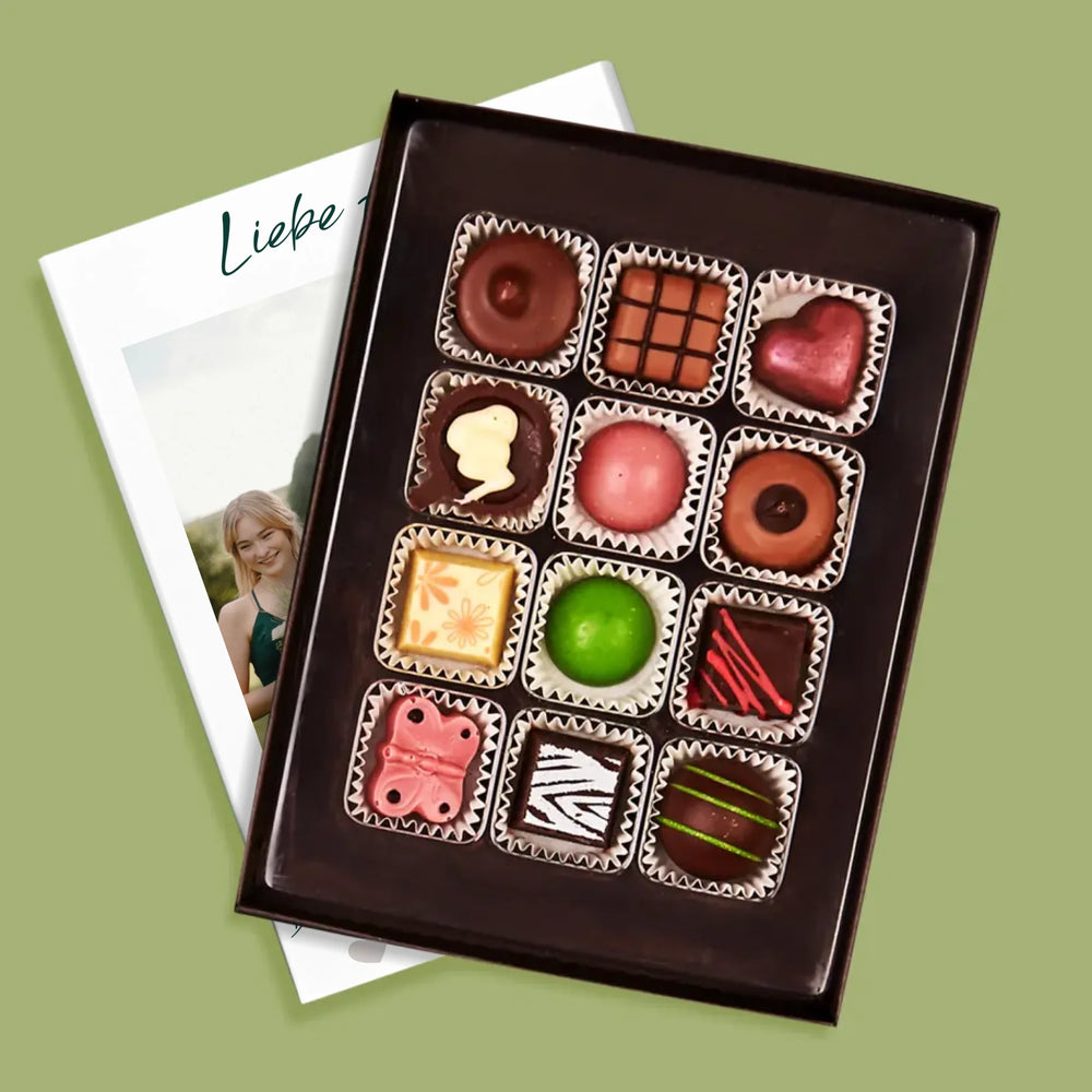 Leckere Pralinen aus belgischer Schokolade in einer eleganten Schachtel, individuell personalisiert.