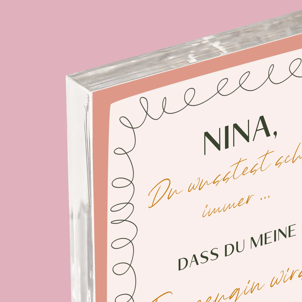 Druck auf einem 2 cm dicken, klaren Acrylblock (Plexiglas), individuell personalisiert.