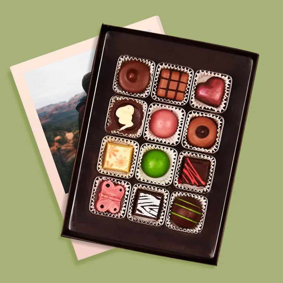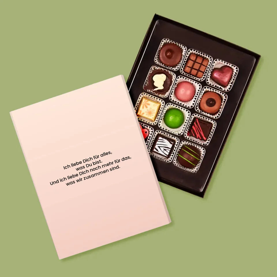 • Leckere Pralinen aus belgischer Schokolade in einer eleganten Schachtel, individuell personalisiert.