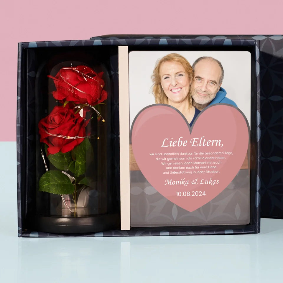 Foto Und Unterschrift: Liebe Eltern - Geschenkset mit Druck auf Acrylglas und ewiger Rose