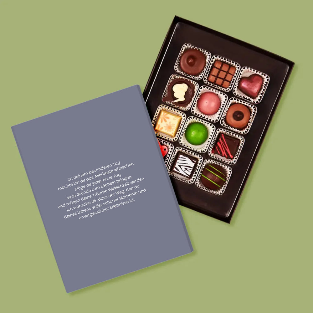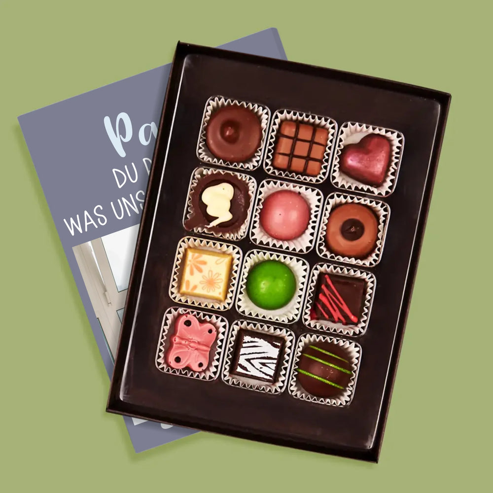 Leckere Pralinen aus belgischer Schokolade in einer eleganten Schachtel, individuell personalisiert.