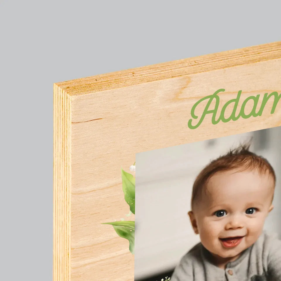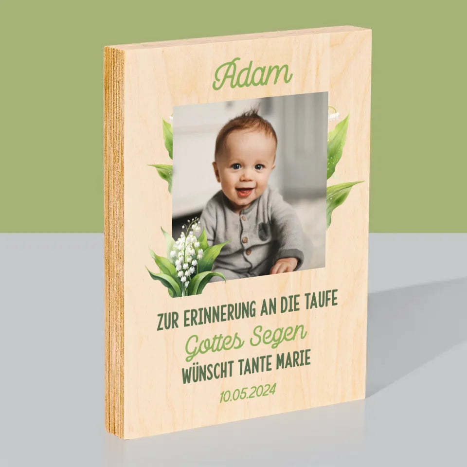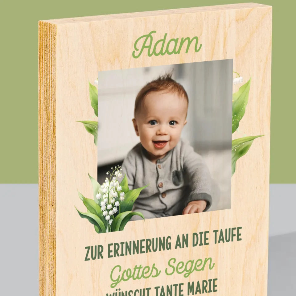Foto Und Unterschrift: Tauferinnerung Maiglöckchen - Druck auf Holz - Vertikal