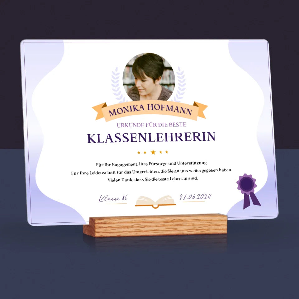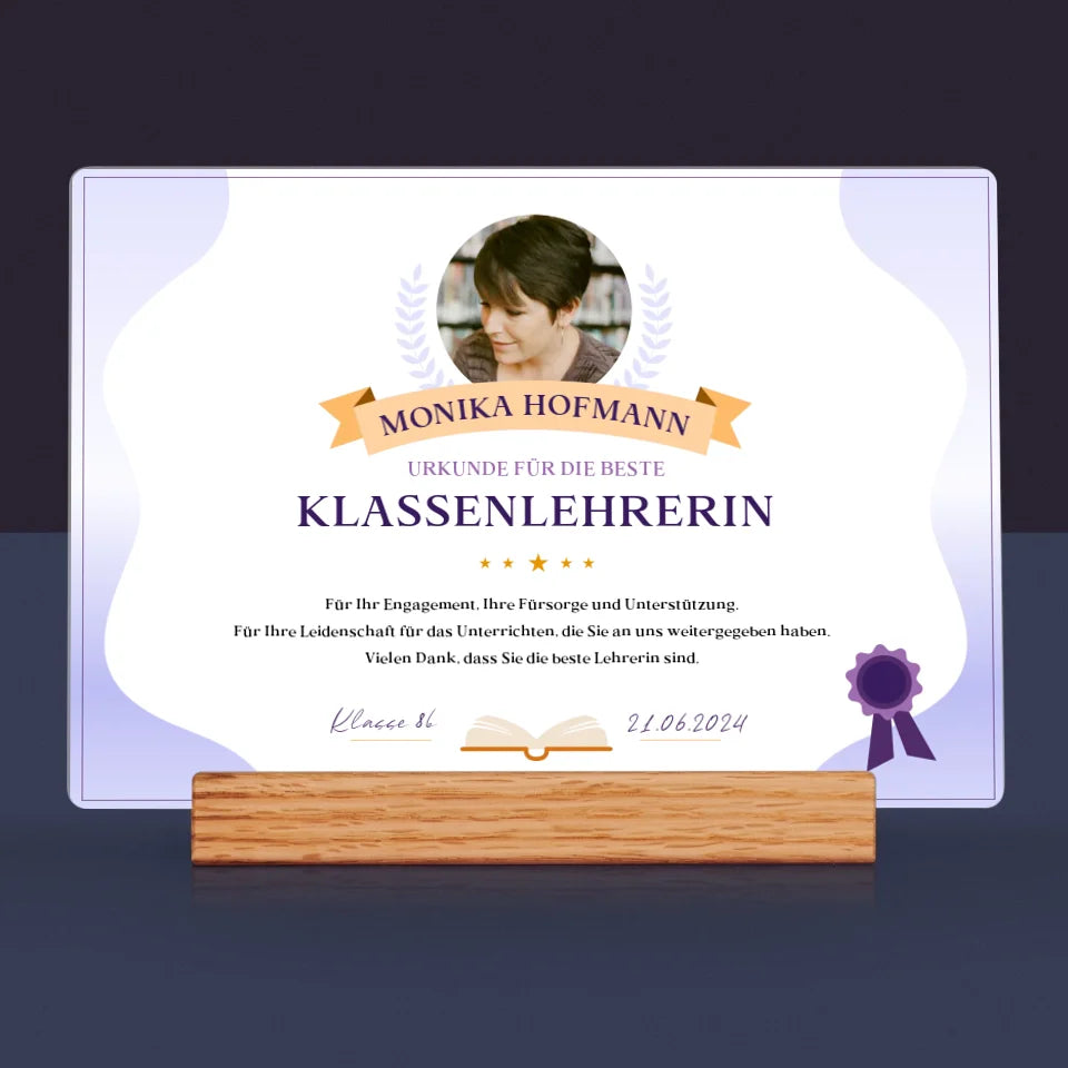 Foto Und Unterschrift: Urkunde Beste Klassenlehrerin - Druck auf Acrylglas mit LED-Beleuchtung
