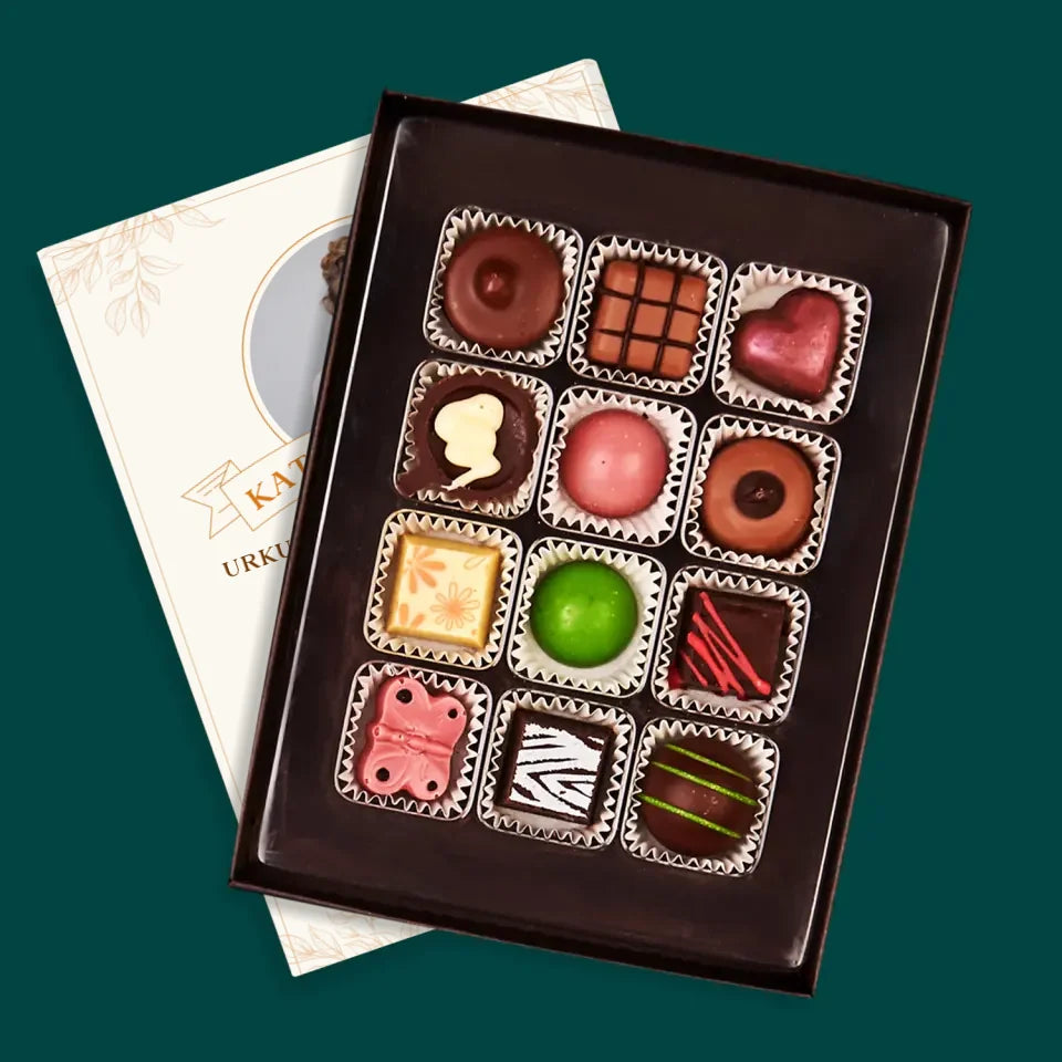 Leckere Pralinen aus belgischer Schokolade in einer eleganten Schachtel, individuell personalisiert.