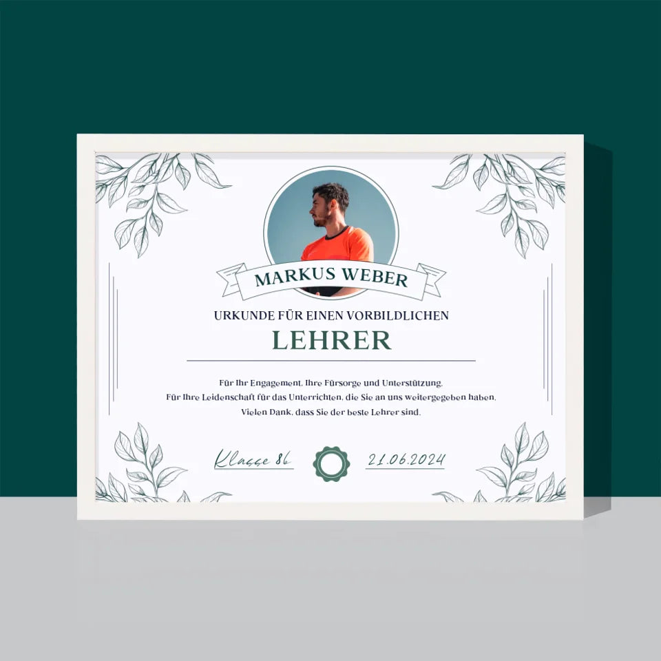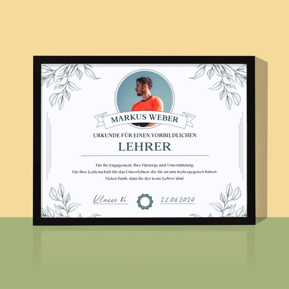 Foto Und Unterschrift: Urkunde Vorbildlicher Lehrer - Druck mit Rahmen 30x40 - Horizontal