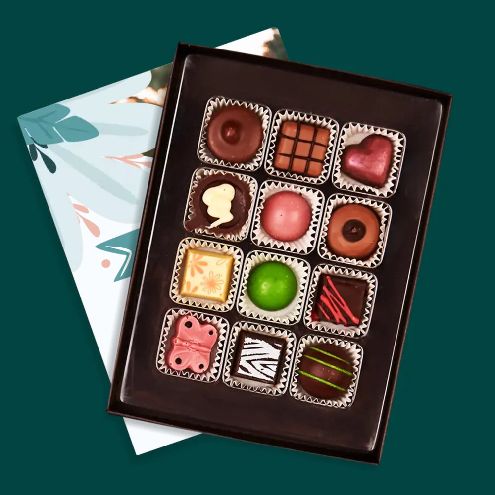 Leckere Pralinen aus belgischer Schokolade in einer eleganten Schachtel, individuell personalisiert.
