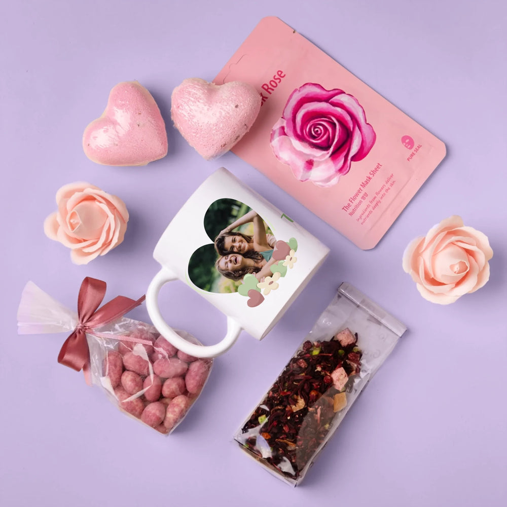 Das Set enthält Schokoladenmandeln, Früchtetee, eine Tuchmaske, eine herzförmige Badebombe und Seifenrosen.