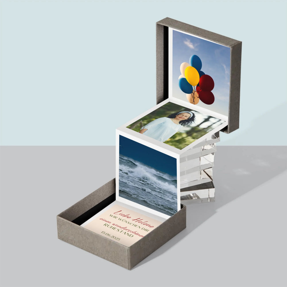 Die Box besteht aus 3 Fotos im Format 6,68 x 6,68 cm und einer personalisierten Karte mit einer persönlichen Widmung.