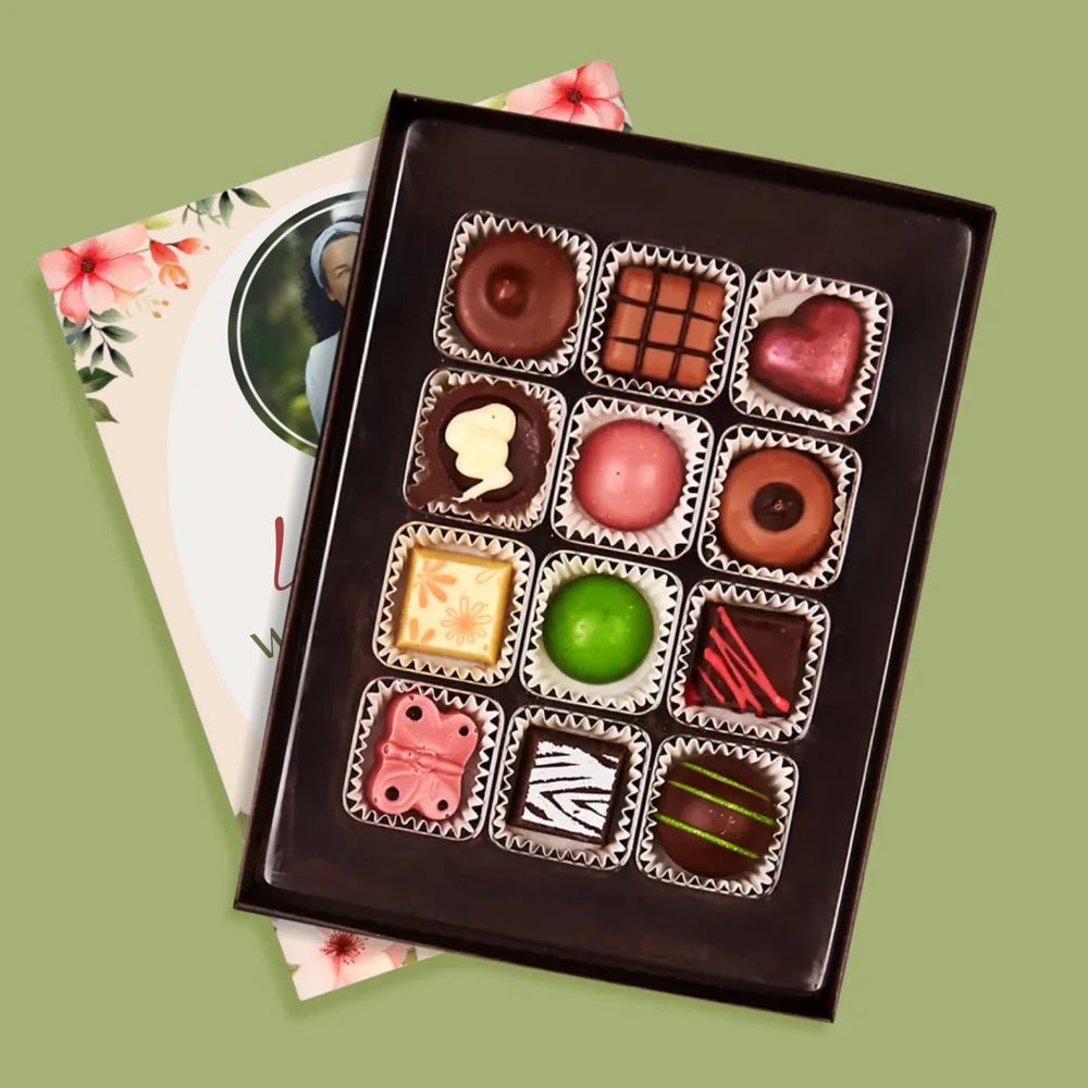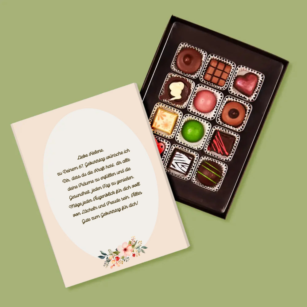 Leckere Pralinen aus belgischer Schokolade in einer eleganten Schachtel, individuell personalisiert.