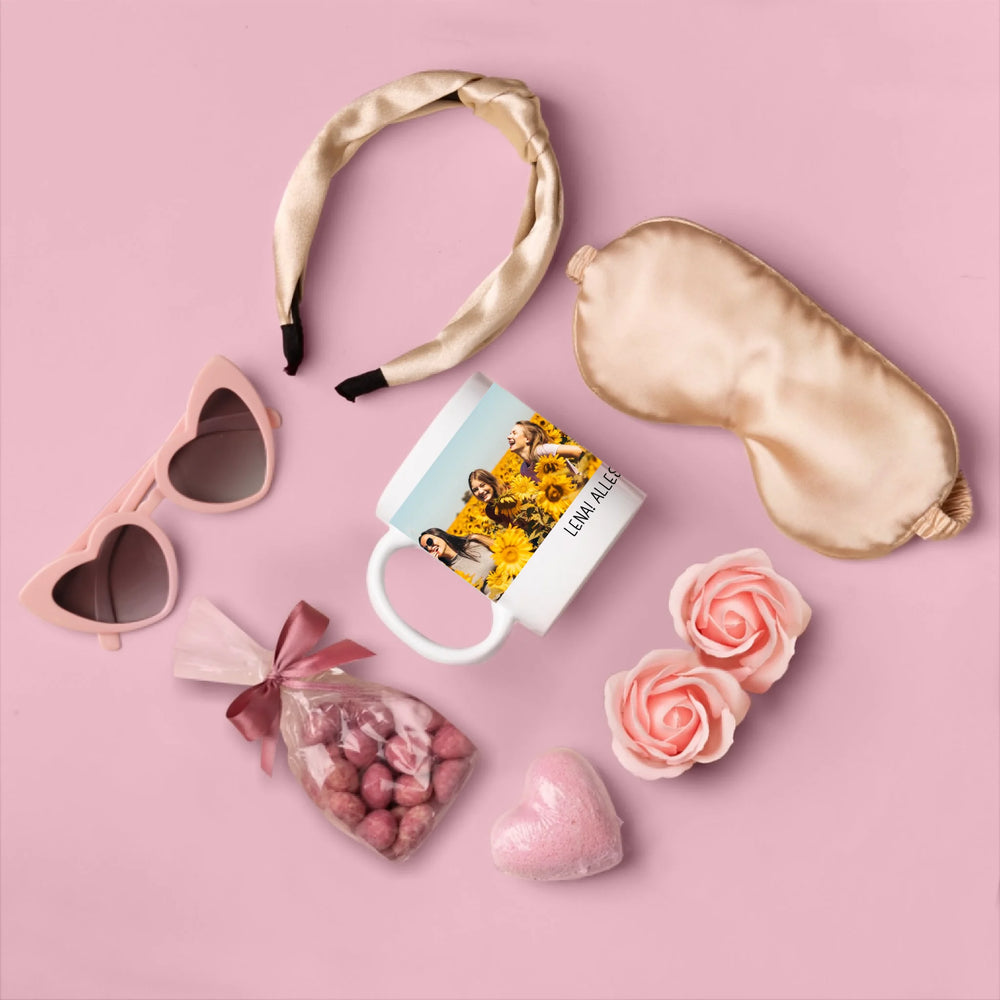 Ein wunderschönes Geschenkset mit einer Tasse mit Wunschpersonalisierung und verschiedenen Accessoires.