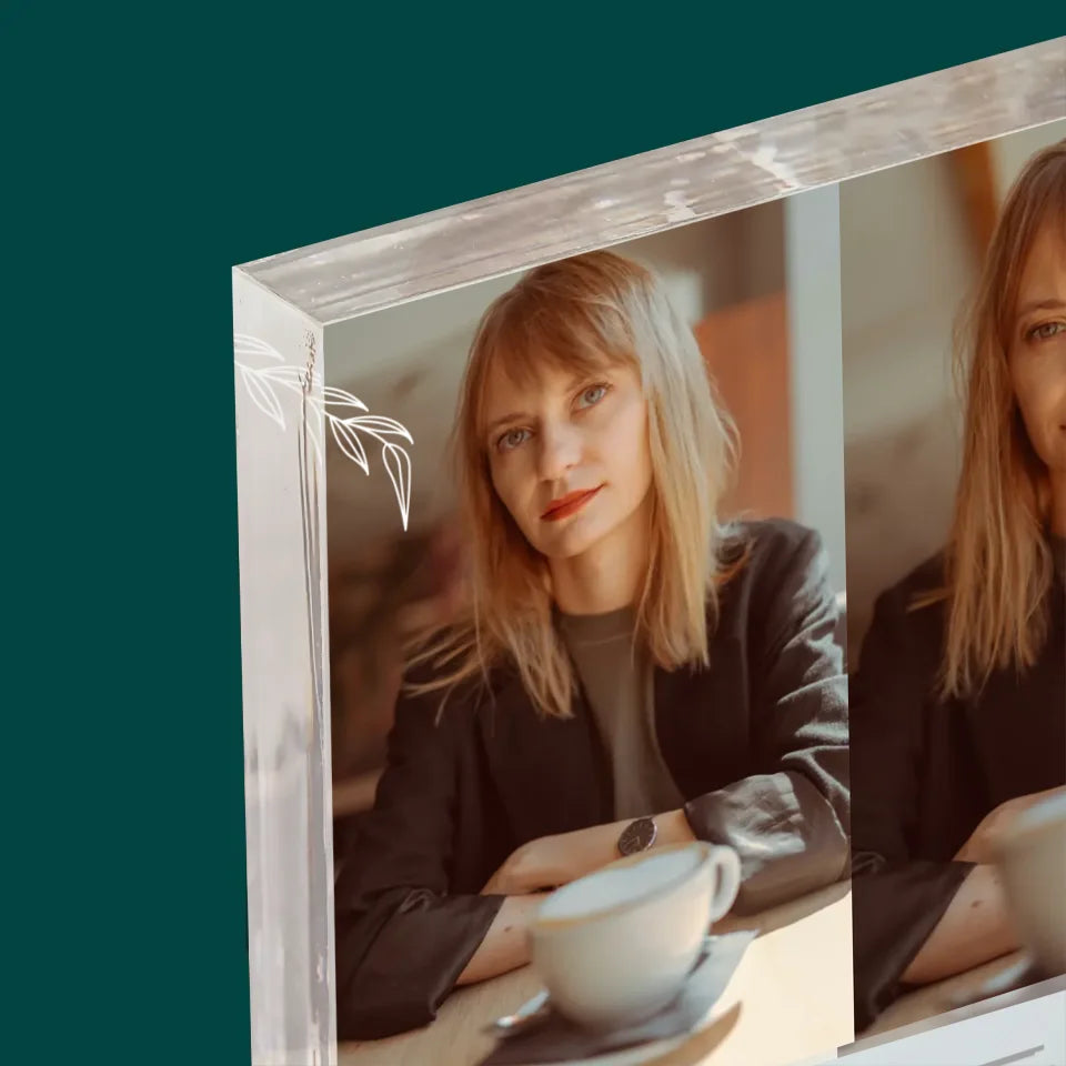 Druck auf einem 2 cm dicken, klaren Acrylblock (Plexiglas), individuell personalisiert.