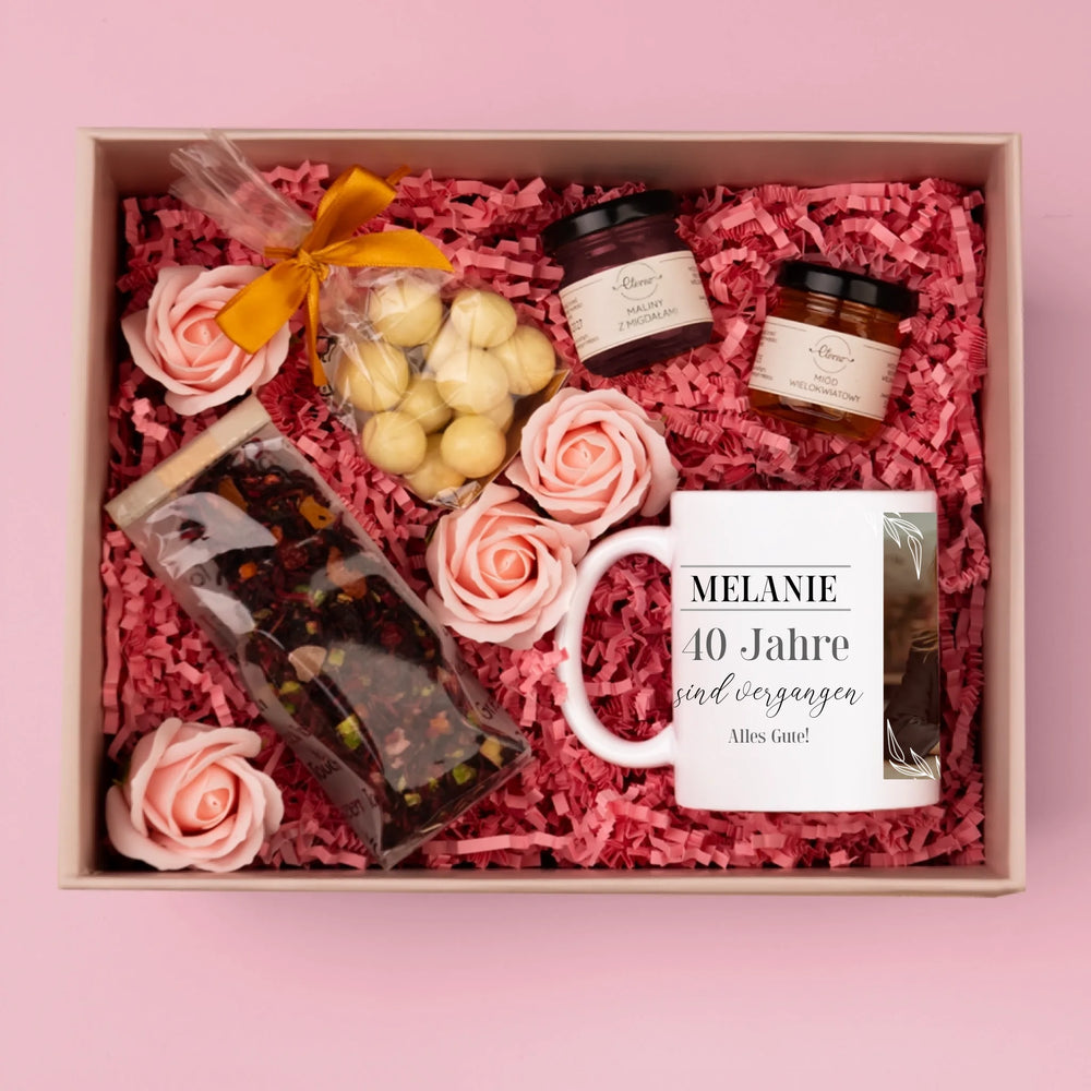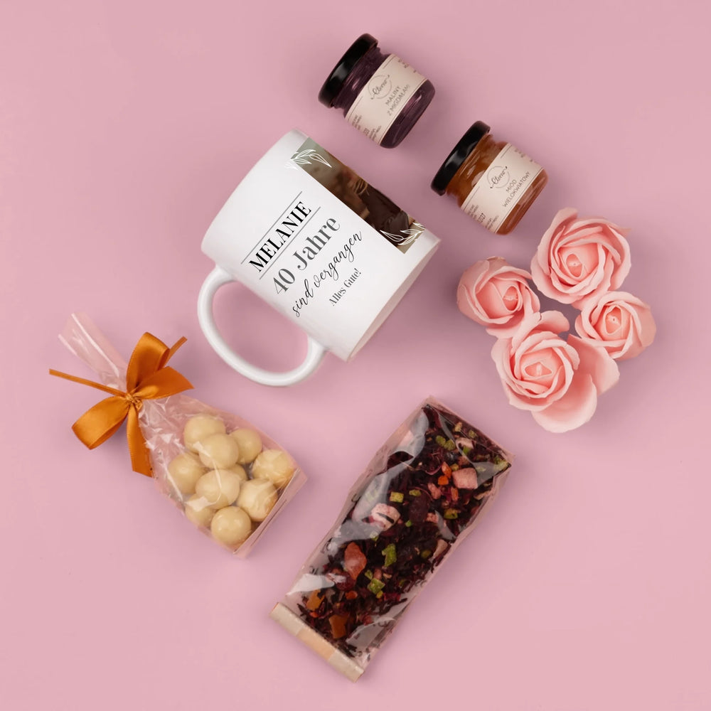 Fotocollage: 40 Jahre Vergangen - Geschenkset mit Tasse, Tee und Süßigkeiten