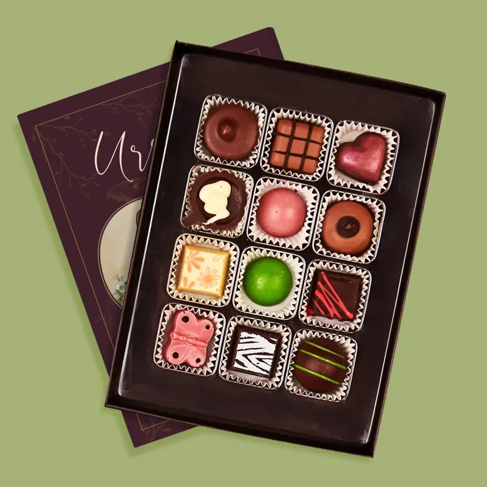 Leckere Pralinen aus belgischer Schokolade in einer eleganten Schachtel, individuell personalisiert.