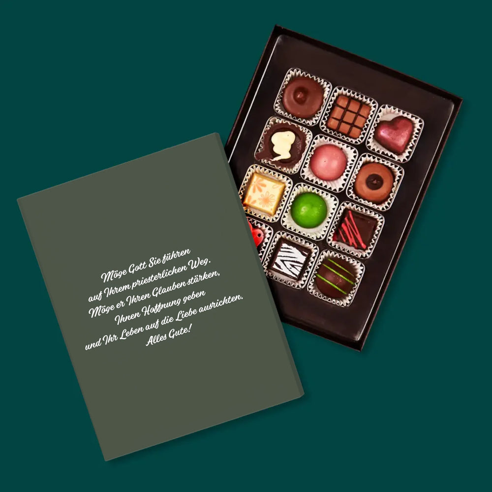 Leckere Pralinen aus belgischer Schokolade in einer eleganten Schachtel, individuell personalisiert.