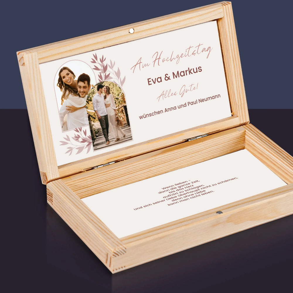 Eine Holzschatulle mit einer Personalisierung Ihrer Wahl.