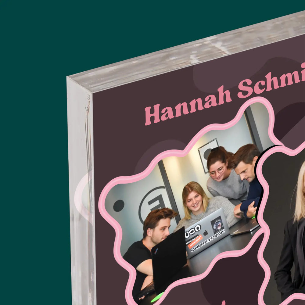 Druck auf einem 2 cm dicken, klaren Acrylblock (Plexiglas), individuell personalisiert.