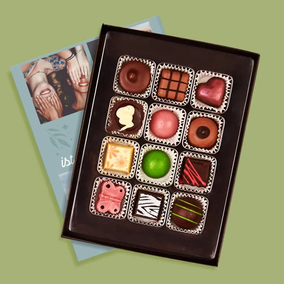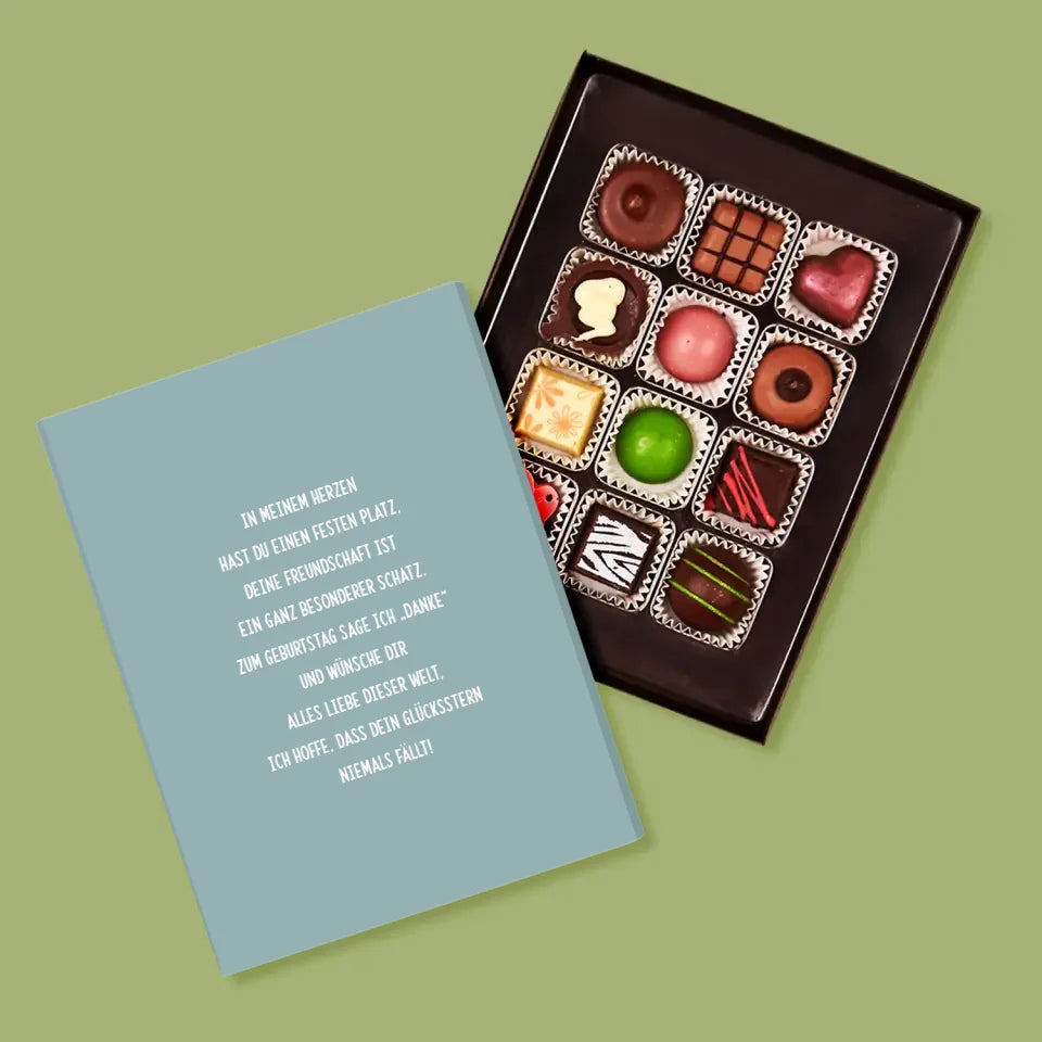 Leckere Pralinen aus belgischer Schokolade in einer eleganten Schachtel, individuell personalisiert.
