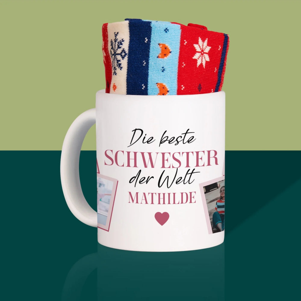 Fotocollage: Beste Schwester Der Welt - Winter-Socken in einer Tasse