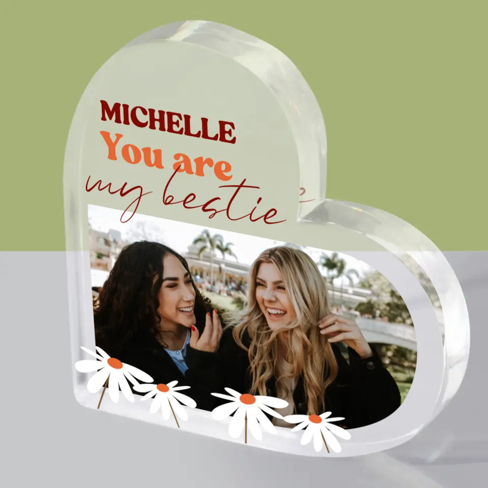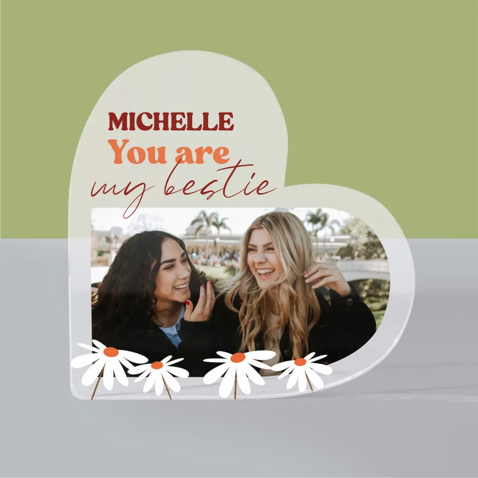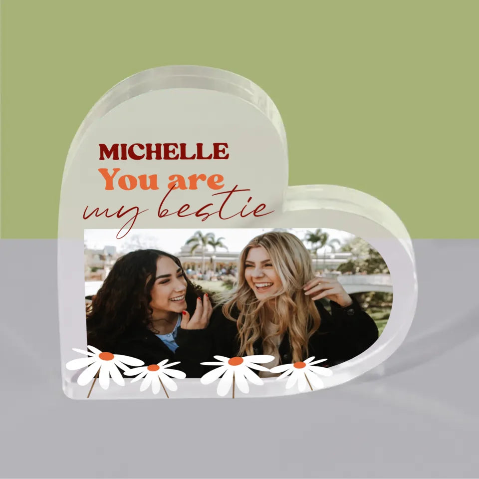 Druck auf einem 1,5 cm dicken, klaren Acrylblock (Plexiglas) in Form eines Herzens, individuell personalisiert.