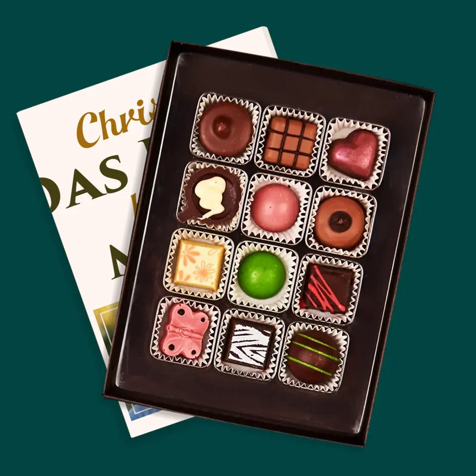 Leckere Pralinen aus belgischer Schokolade in einer eleganten Schachtel, individuell personalisiert.