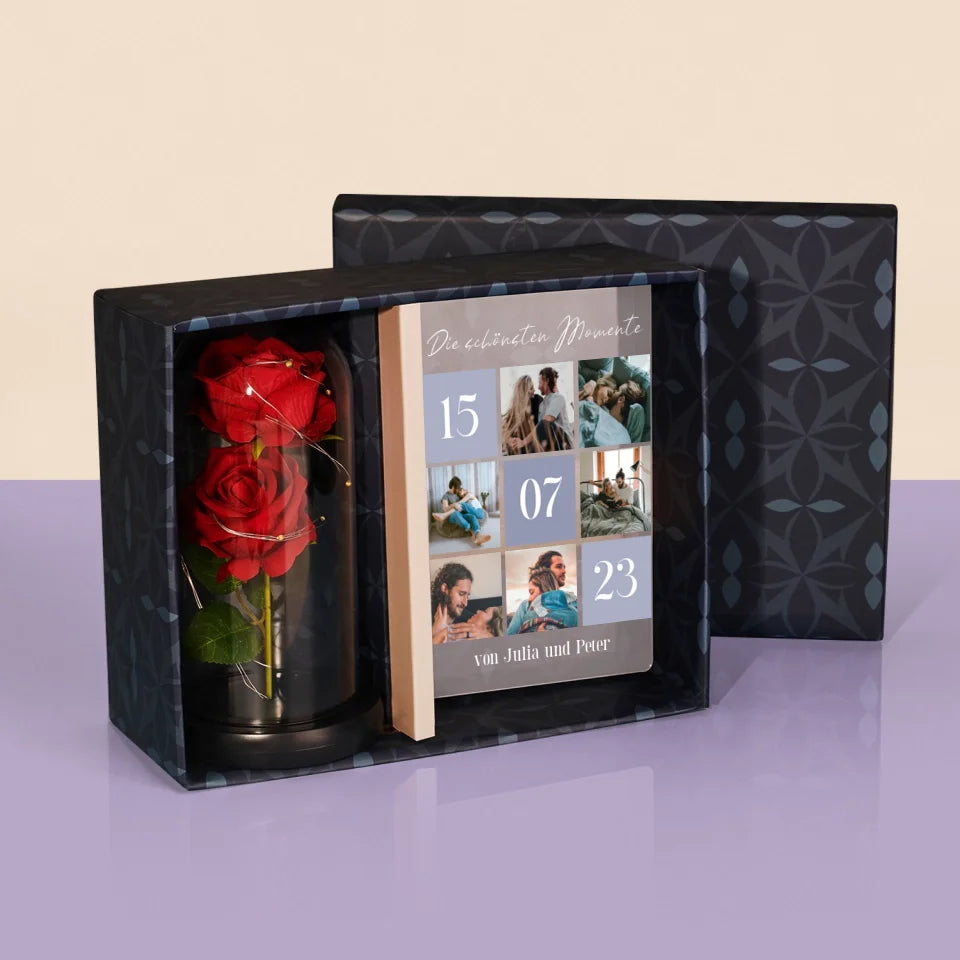 Fotocollage: Die Schönsten Momente - Geschenkset mit Druck auf Acrylglas und ewiger Rose